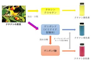 また、クチナシ果実に含まれるゲニボシドからは、クチナシ赤色素、ならびにクチナシ青色素の3種類の色素がつくられております。