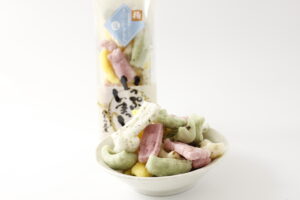 着色料は赤色、黄色、緑色と3色ありますが、この3色は全てクチナシ色素で色付けしております。